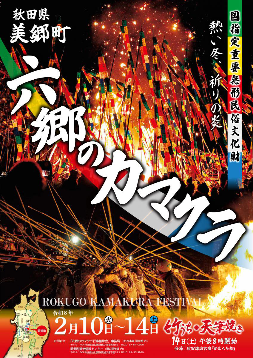 豊作祈願の火祭として700年余りの歴史がある貴重な小正月行事ですので、ぜひ「六郷のカマクラ」と「竹うち」をご観覧ください。
