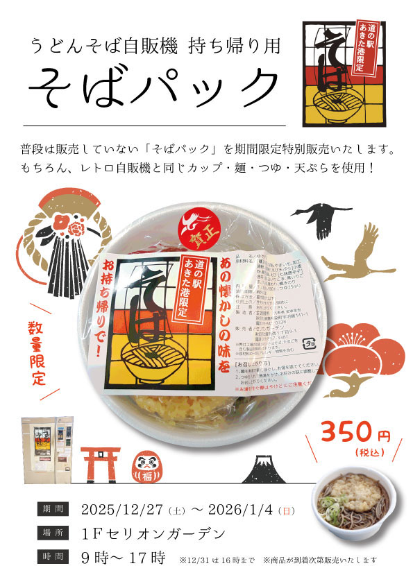 【秋田市】うどんそば自販機の「そばパック」をセリオンで期間限定販売!(12/27~1/4)