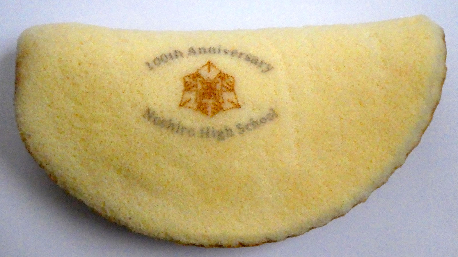 スポンジ生地の表面には、フードプリンターを使って「能代高等学校」の校章と、創立100周年記念の文字が描かれています。