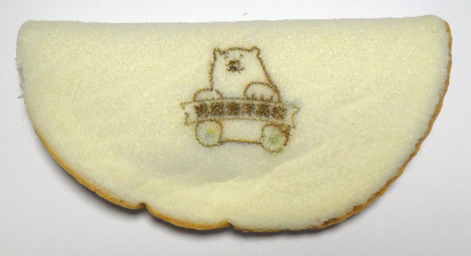 しろくまのような真っ白なスポンジ生地の表面には、しろくまのイラストと「男鹿海洋高校」の文字がプリントされています。