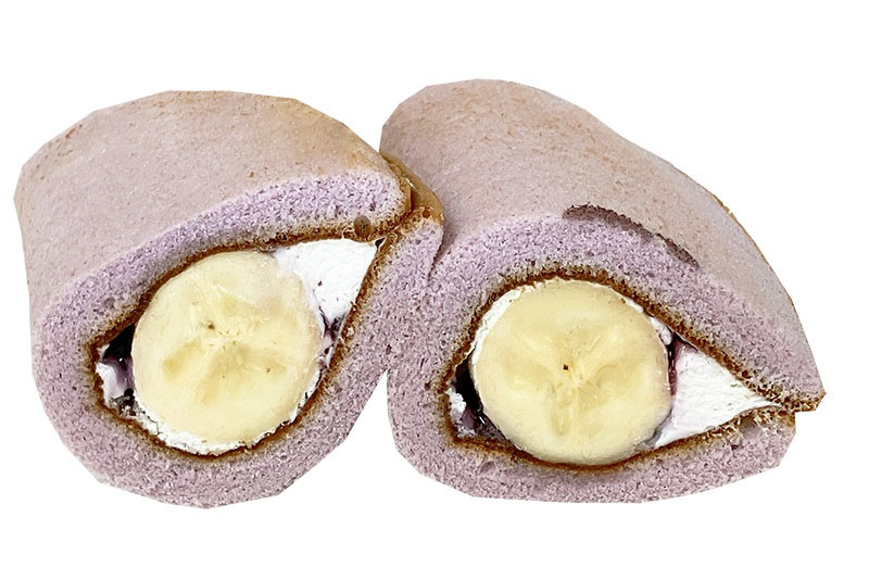 ブルーベリー風味のスポンジ生地の間には、アサイージャムとブルーベリージャム、ヨーグルト風味ホイップクリーム、バナナがサンドされています。