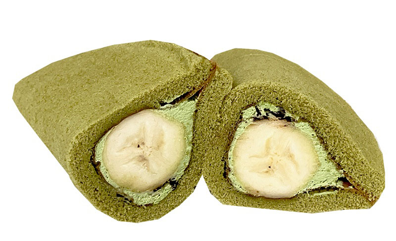 抹茶風味のスポンジ生地の間に、抹茶風味ホイップクリーム、パリパリチョコ、バナナがサンドされている、和風で贅沢な味わいのバナナボートです。