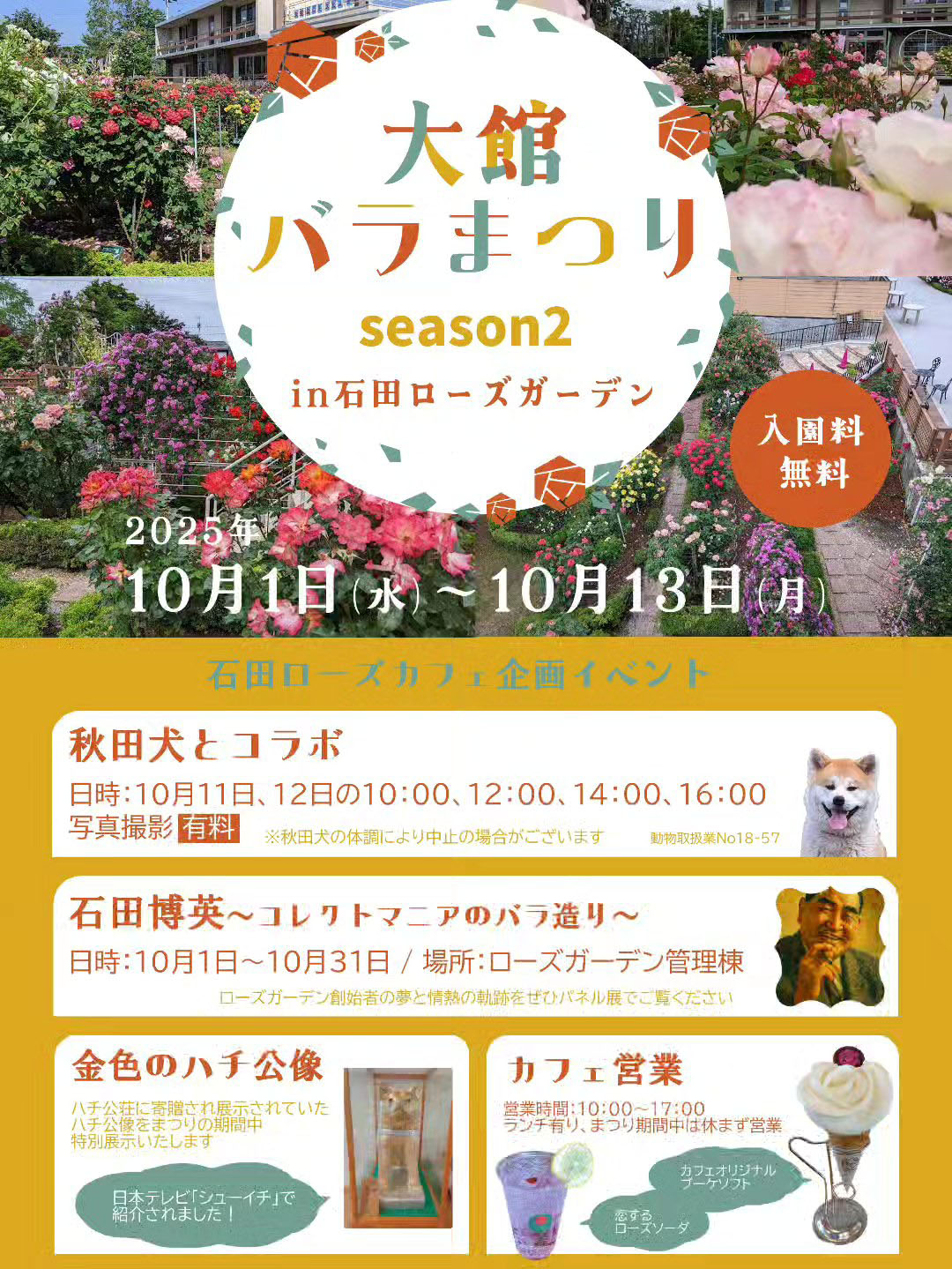 大館市の石田ローズガーデンで、10月1日(水)~13日(月・祝)に「大館バラまつり シーズン2」が開催されます。