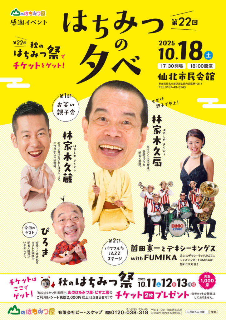 「山のはちみつ屋」または「ピザ工房」で、秋のはちみつ祭の期間中に税抜2,000円以上ご購入いただいたお客さまには、仙北市民会館で10月18日(土)に開催される「はちみつの夕べ」のチケットが2枚プレゼントされますので、こちらもぜひゲットしてくださいね。