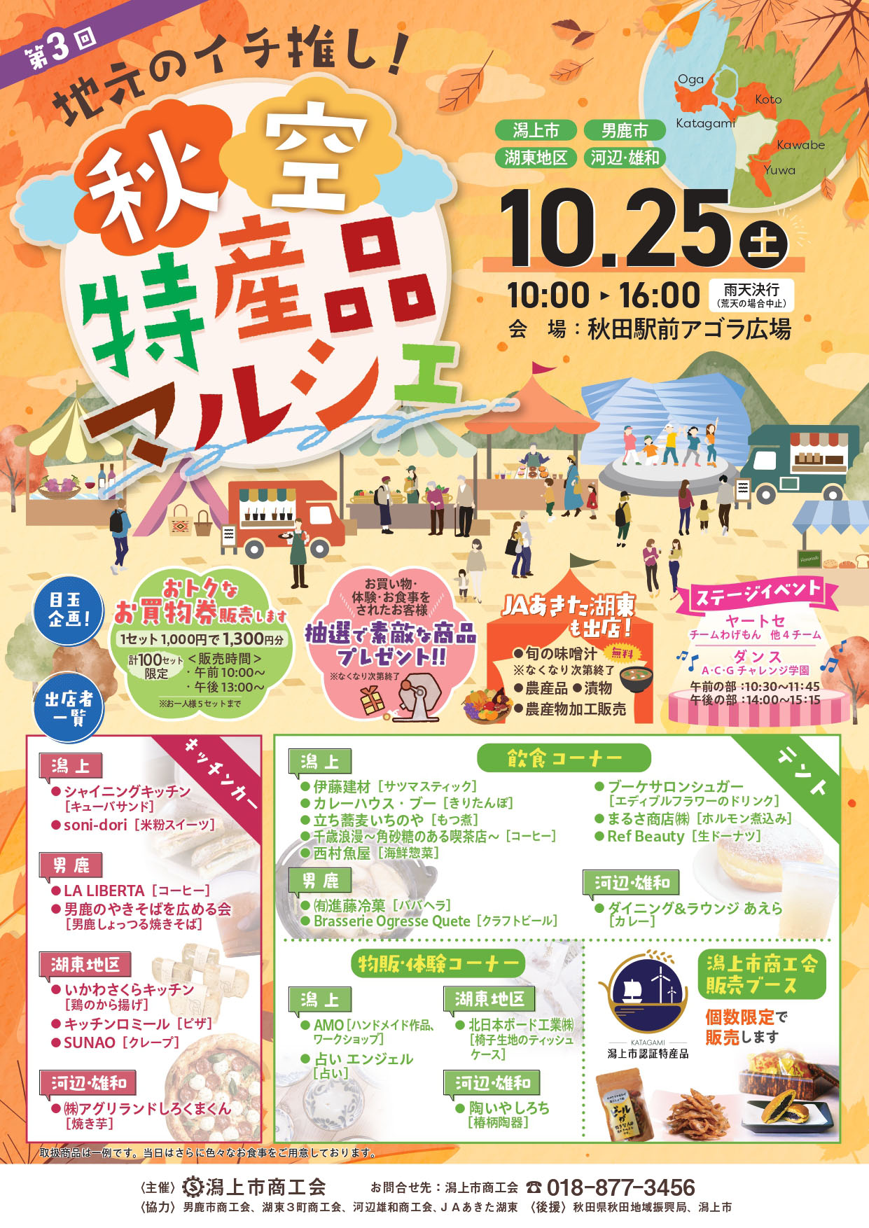 この日は潟上市、男鹿市、湖東地区、河辺・雄和地区の商工会が協力し、イチ推しの特産品、飲食物、雑貨などを販売します。