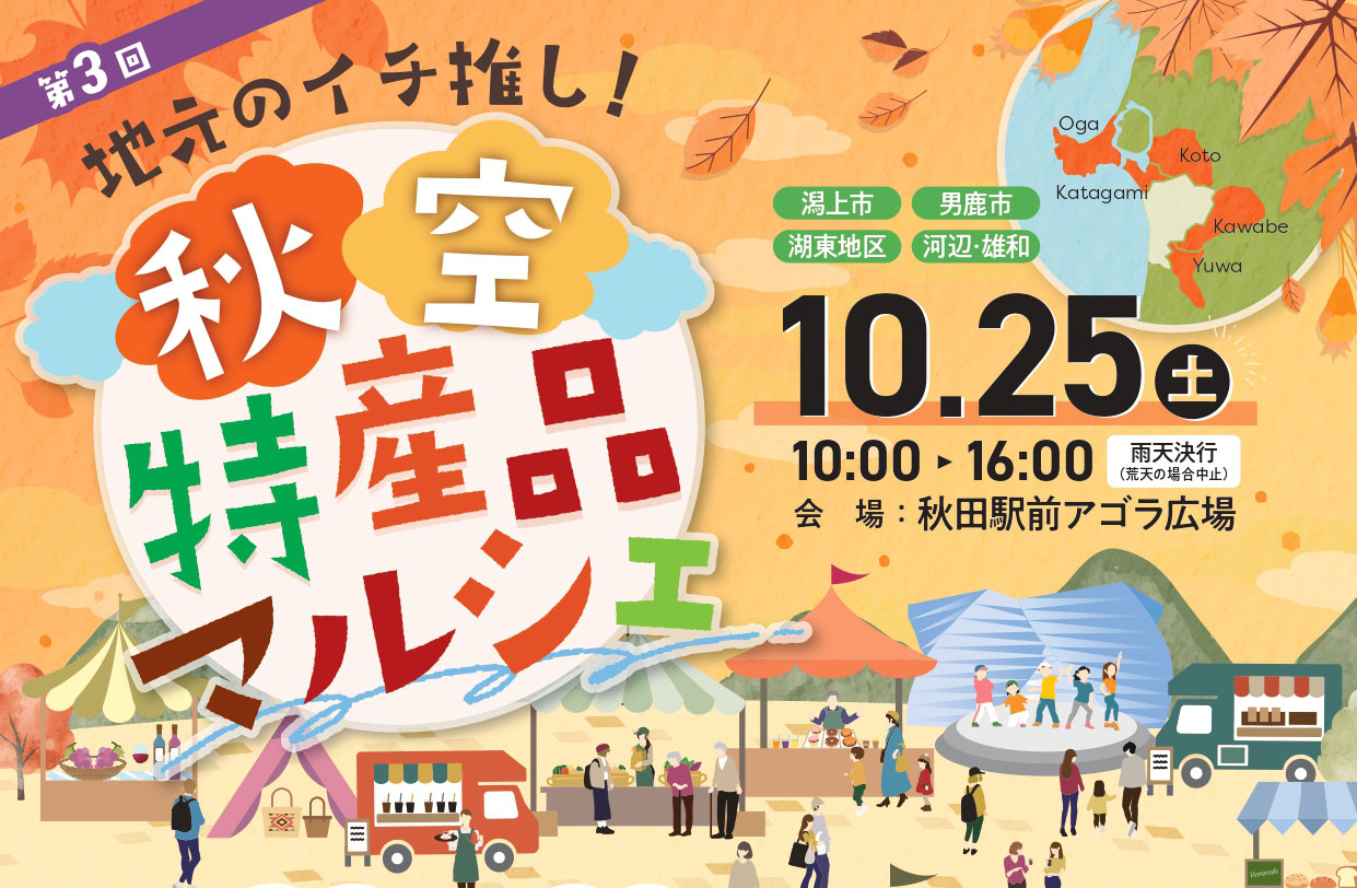 「地元のイチ推し!秋空特産品マルシェ」が、秋田駅前のアゴラ広場で10月25日(土)に開催されます。