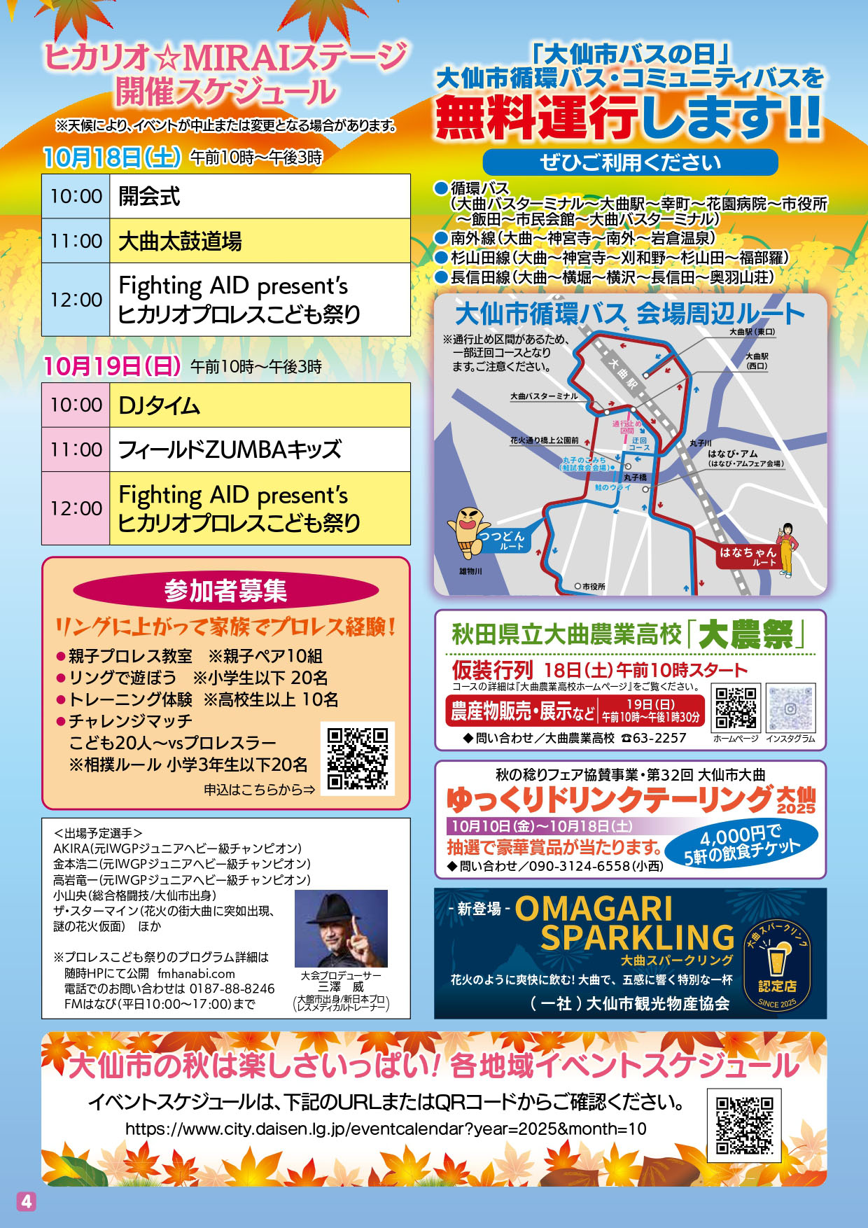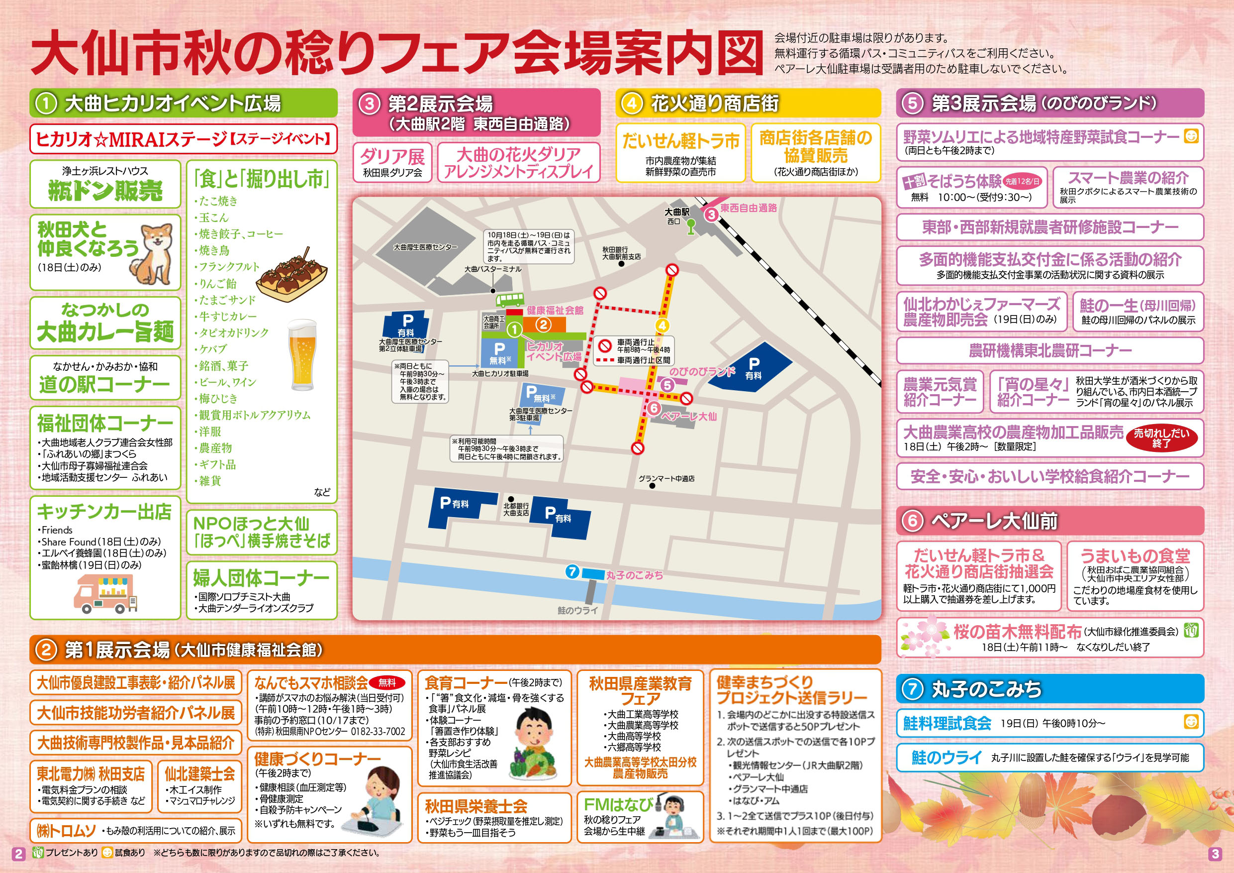 当日は大曲ヒカリオイベント広場、大仙市健康福祉会館、大曲駅、花火通り商店街、のびのびランド、ペアーレ大仙前、丸子のこみちを会場にして、さまざまなイベントが行われます。