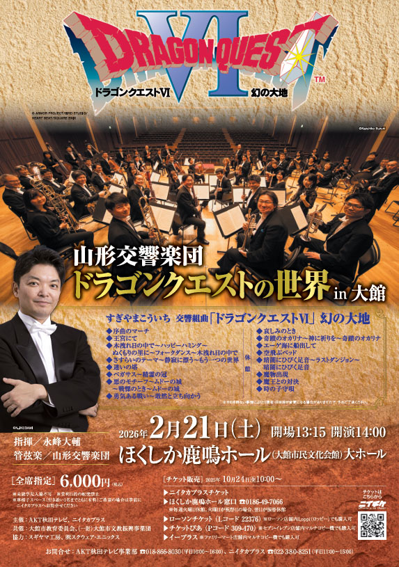 【大館市】山形交響楽団「ドラゴンクエストの世界 in大館」をほくしか鹿鳴ホールで2月21日開催!