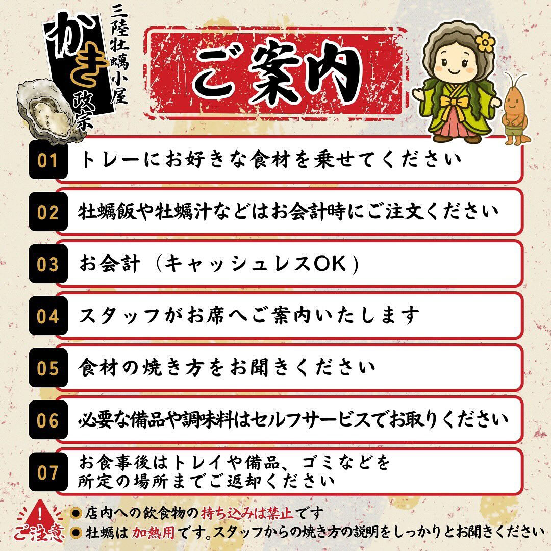 枝豆・唐揚げ・ポテト・牡蠣飯・牡蠣汁などのサイドメニューも用意されていますので、ぜひお越しください。