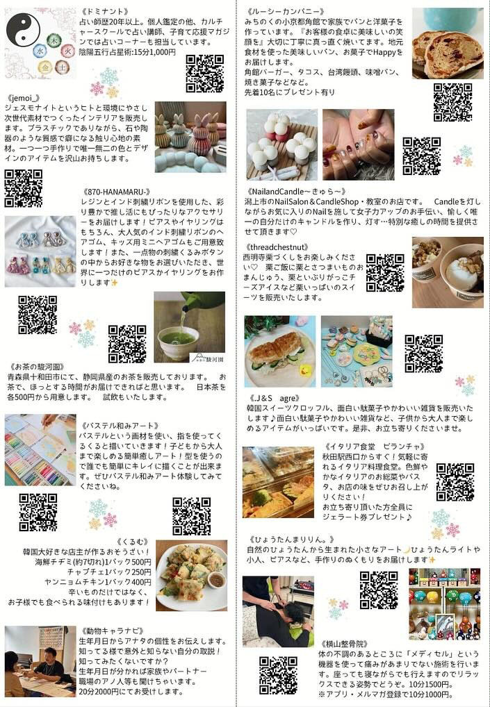 会場には、フード、雑貨、占い、アクセサリー、ワークショップ、リフレ/マッサージなどのお店が大集合します。