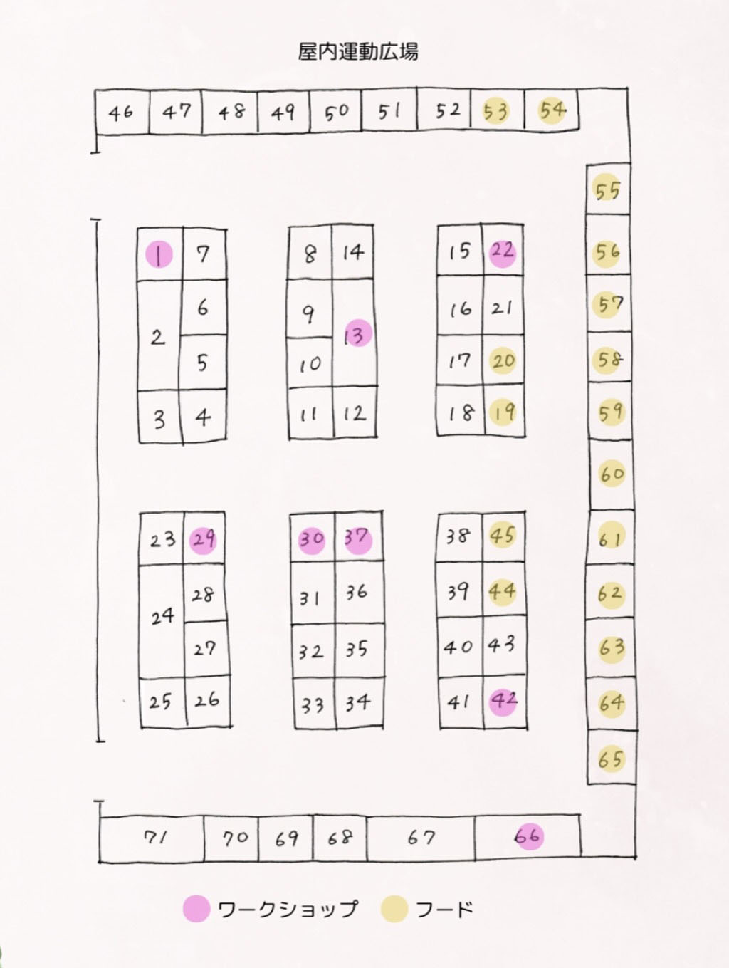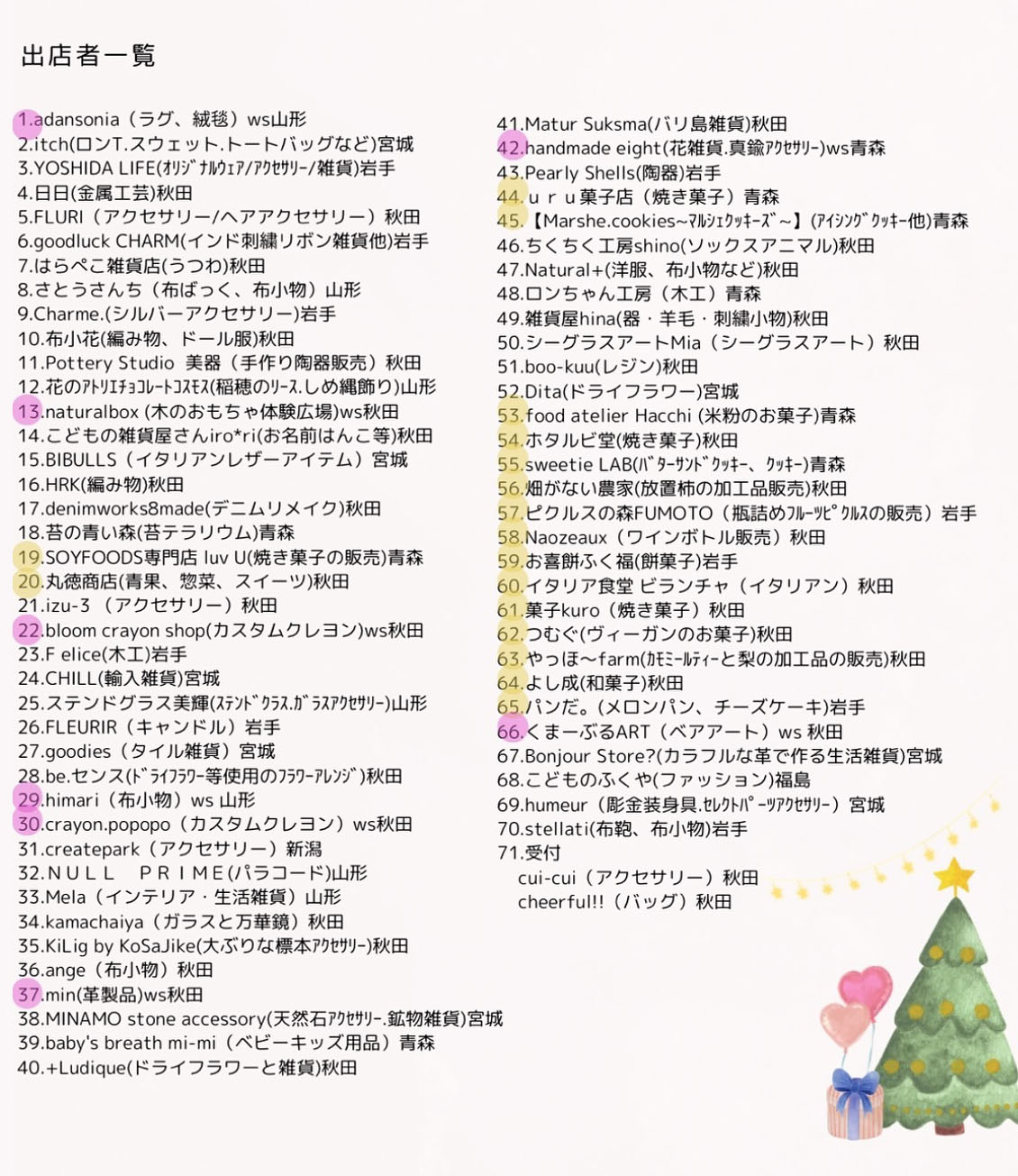 秋田県内外から集まった総勢72組の出店者たちが、雑貨や布小物、工芸品、スイーツ、ワークショップなど、さまざまなお店を展開しますので、ぜひご来場ください。