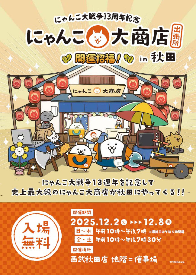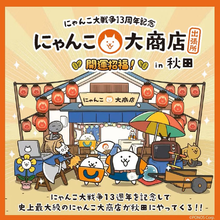 「にゃんこ大戦争」13周年を記念して、西武秋田店で「にゃんこ大商店 出張所」が開催されます。