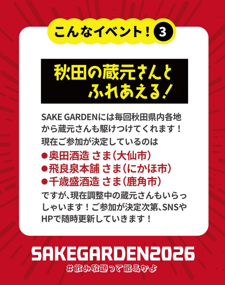 「SAKE GARDEN2026 #飲み放題って最高かよ」が秋田市で開催されます。