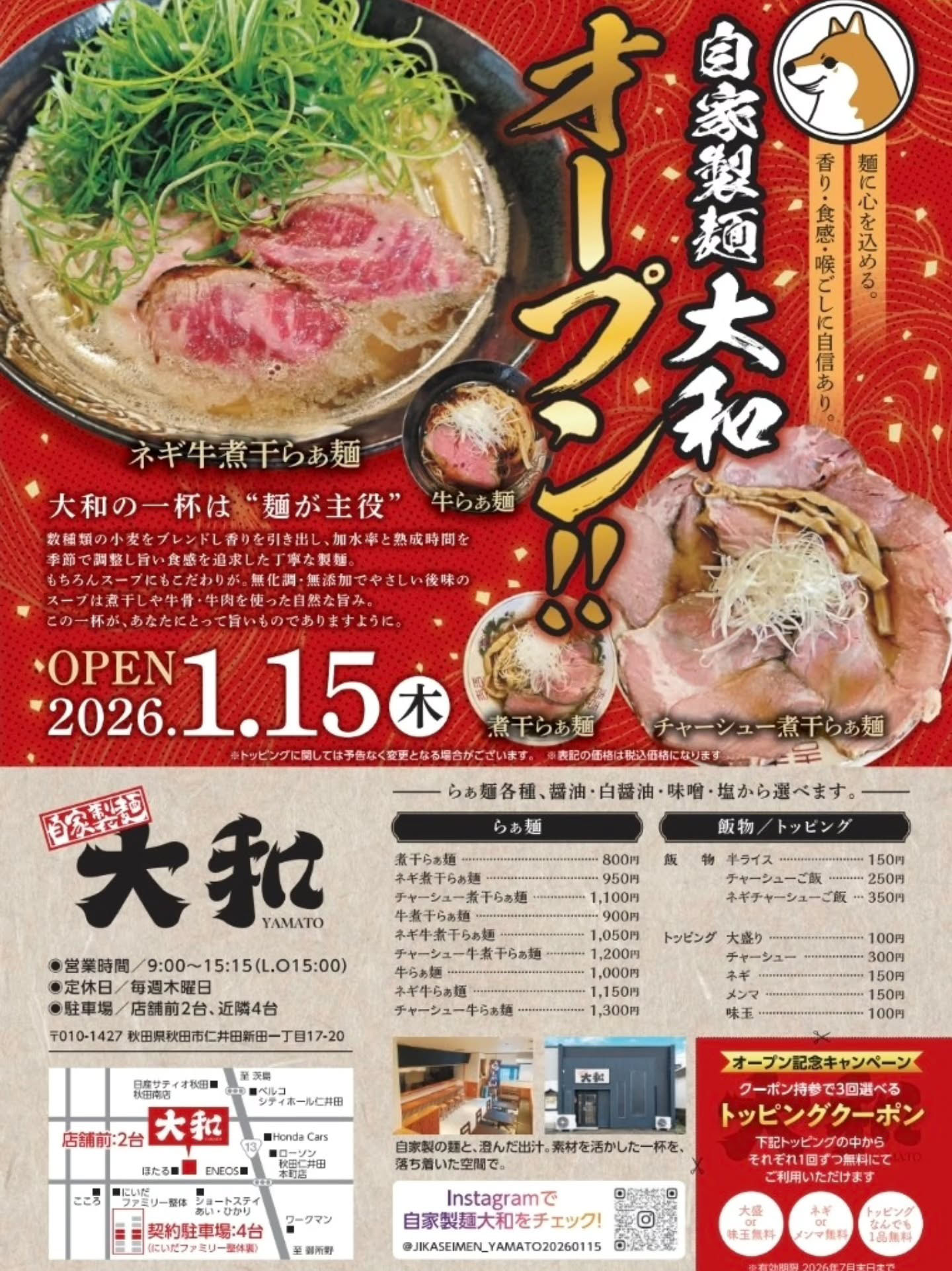 『自家製麺 大和』が秋田市仁井田にオープンします。