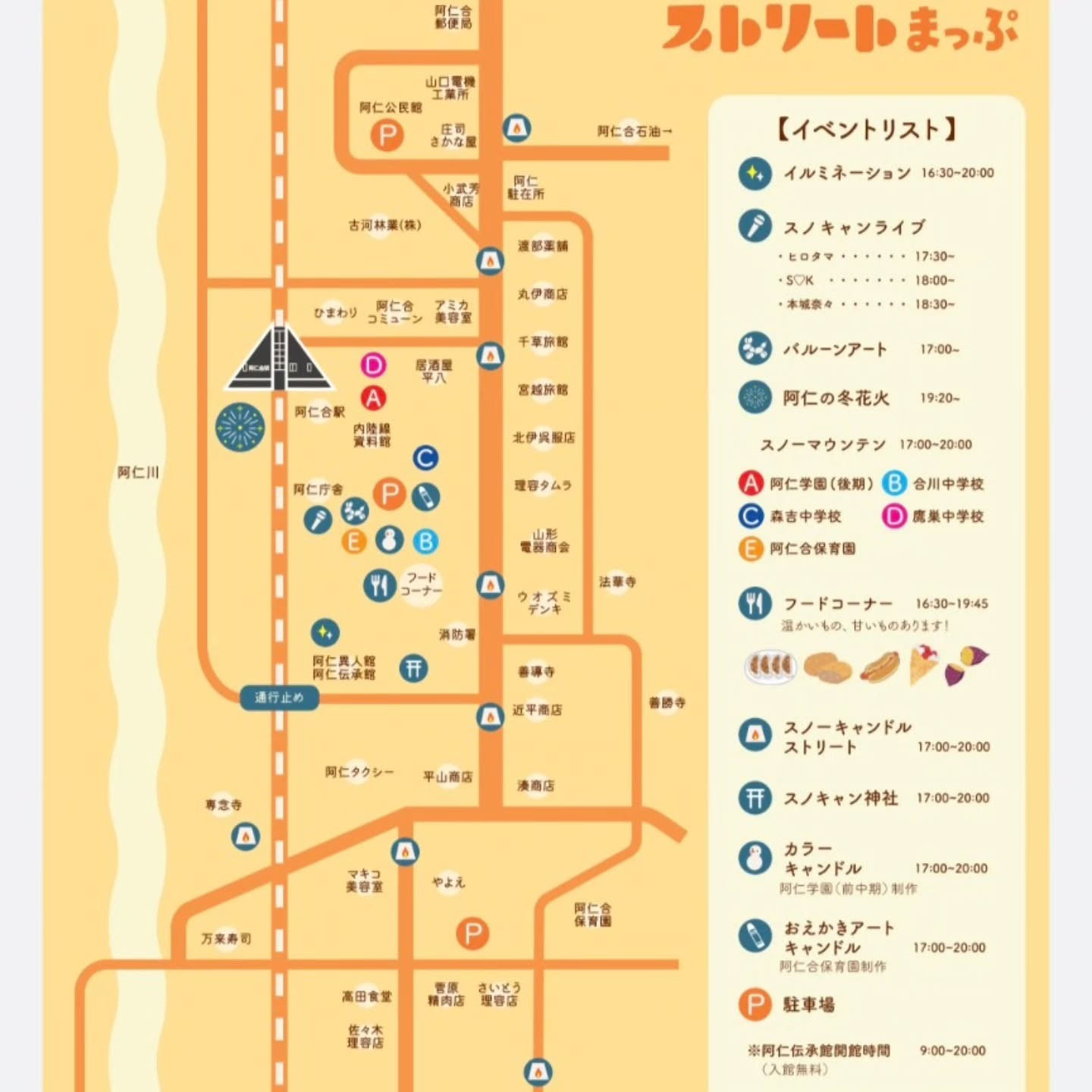 阿仁合駅周辺や阿仁異人館ではさまざまなイベントが行われ、19時20分からは冬花火も打ち上げられますので、ぜひご来場ください。