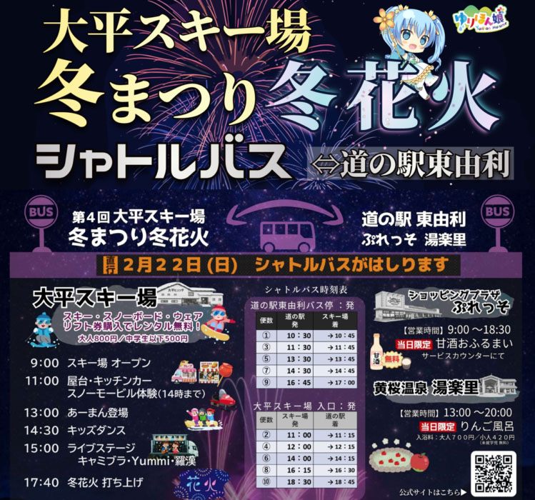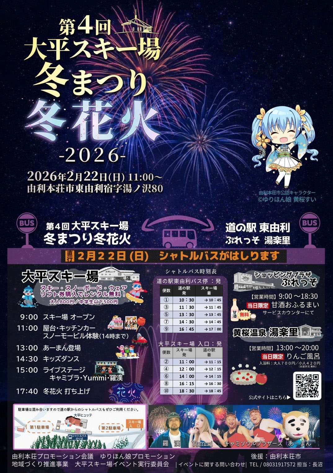 由利本荘市で「大平スキー場 冬まつり冬花火」が2月22日(日)に開催されます。