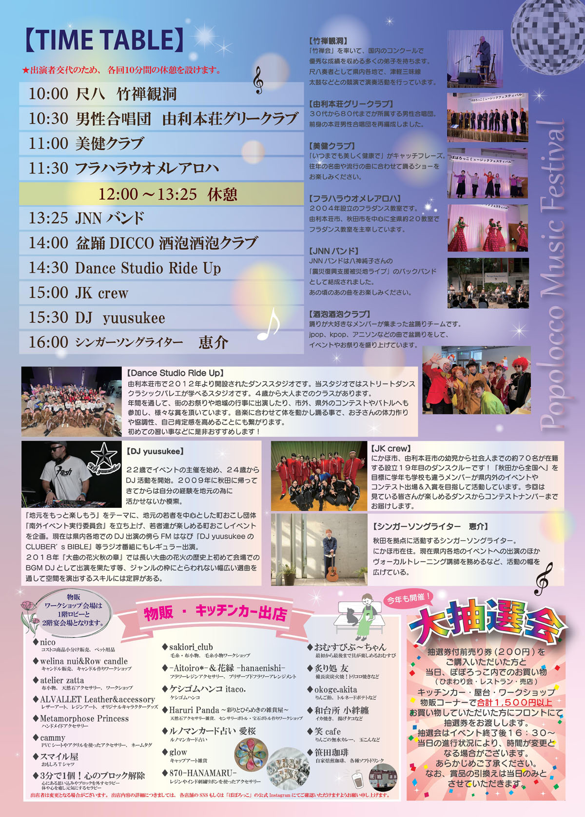 ステージパフォーマンス、物販、キッチンカー、抽選会など、イベント盛りだくさんです。