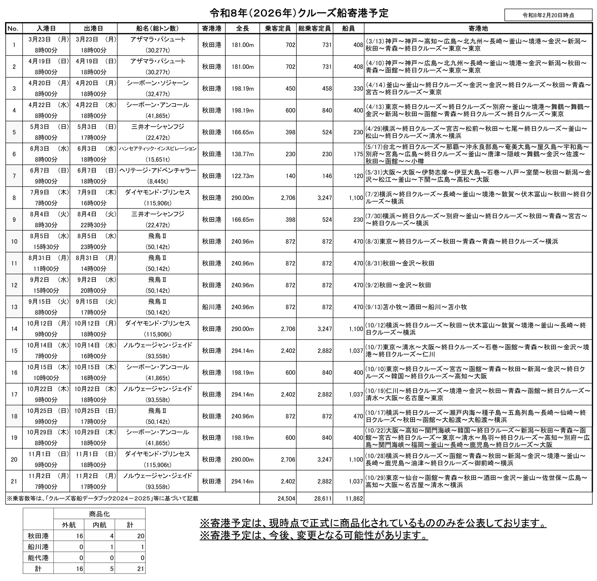寄港予定は今後変更になる可能性もありますので、最新の情報は秋田県公式サイトでご確認ください。