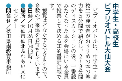 中学生・高校生 ビブリオバトル大仙大会 | 大仙市・ 大仙市仙北ふれあい文化センター | 2025/10/26(日) |