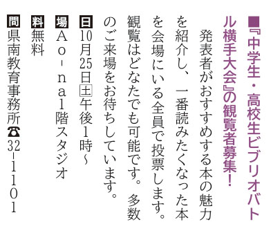 中学生・高校生 ビブリオバトル横手大会 | 横手市・Ao-na | 2025/10/25(土) |