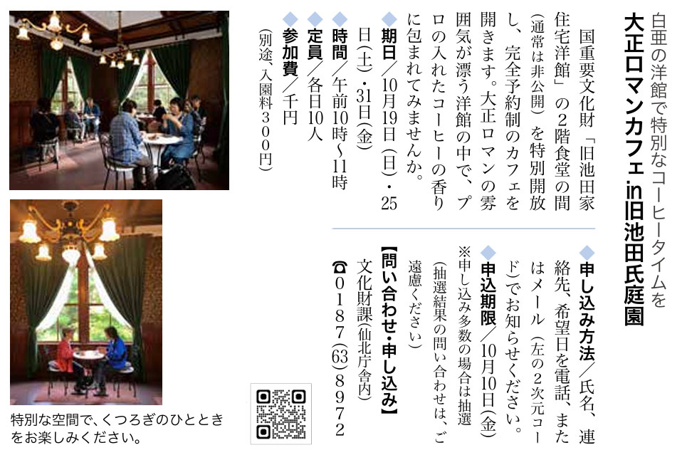 大正ロマンカフェ in旧池田氏庭園※完全予約制・定員10名 | 大仙市・旧池田氏庭園 旧池田家住宅洋館 | 2025/10/25(土) |