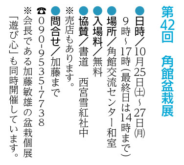 角館盆栽展 | 仙北市・ 角館交流センター | 2025/10/25(土)~2025/10/27(月) |
