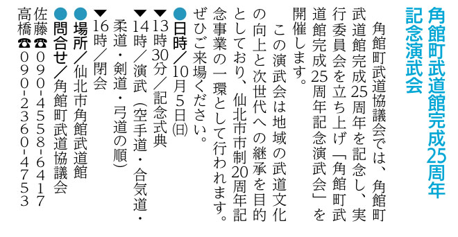 角館町武道館 完成25周年記念演武会 | 仙北市・仙北市角館町武道館 | 2025/10/05(日) |