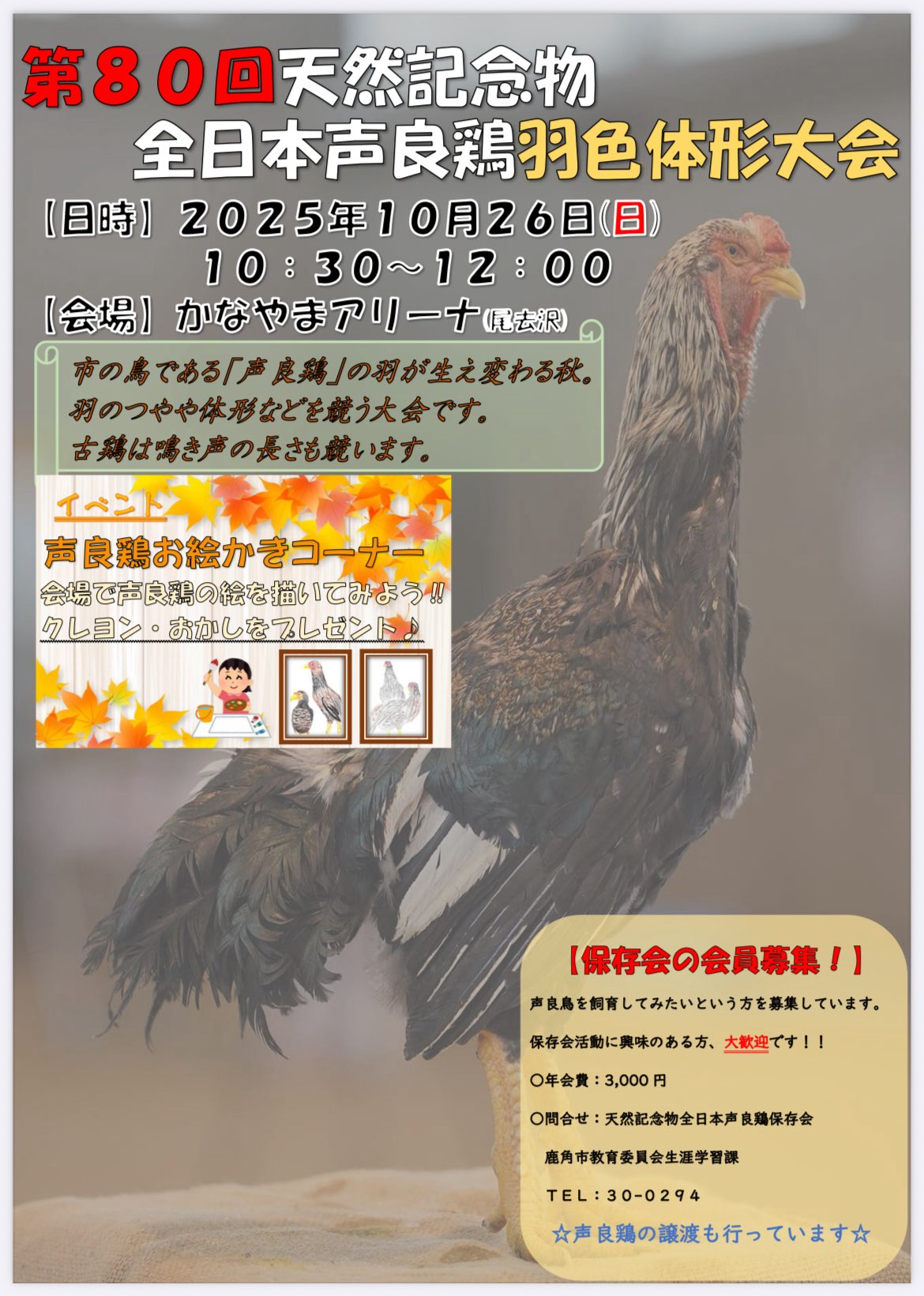 天然記念物 全日本声良鶏 羽色体形大会 | 鹿角市・かなやまアリーナ | 2025/10/26(日) |
