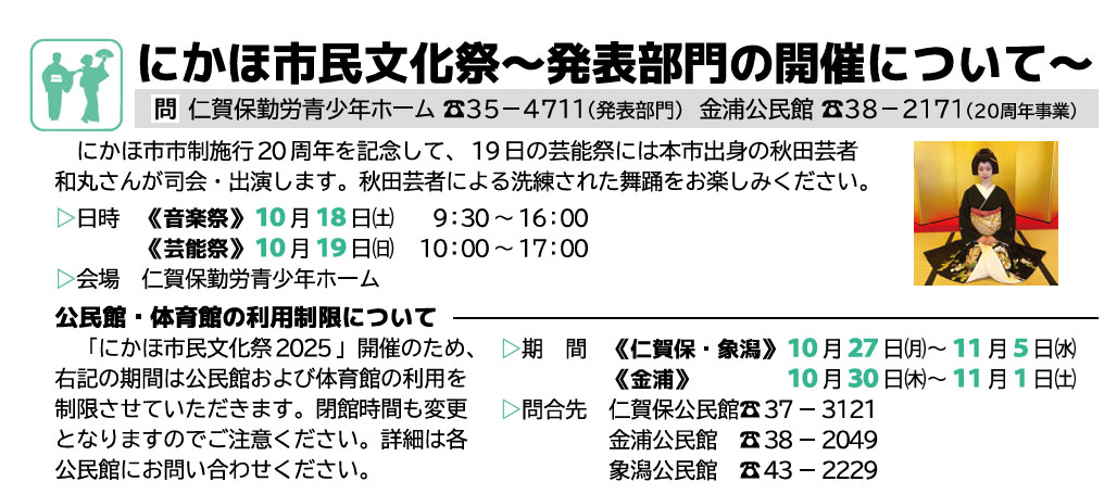 花輪市民センターまつり | 鹿角市・コモッセ | 2025/10/24(金)~2025/10/26(日) |