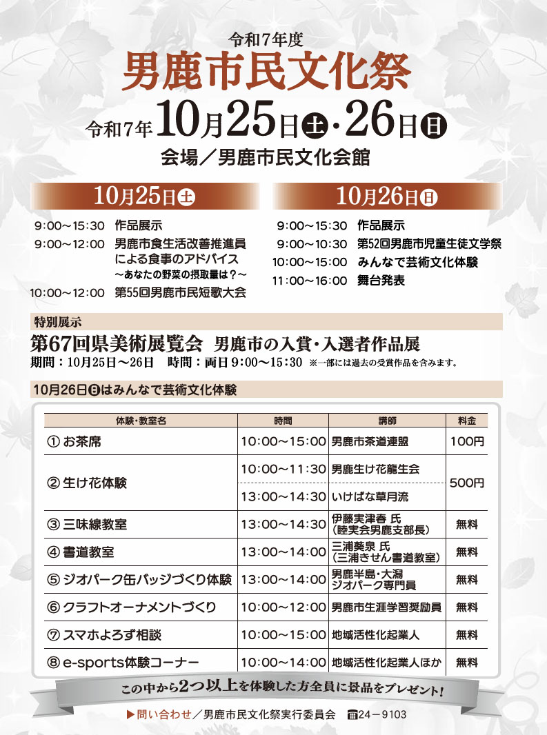 男鹿市民文化祭 | 男鹿市・男鹿市民文化会館 | 2025/10/25(土)~2025/10/26(日) |
