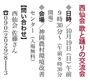 西仙会 歌と踊りの交流会 | 大仙市・ 神岡農村環境改善センター | 2025/10/19(日) |