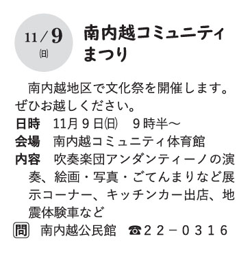 | 町産業文化祭 | 五城目町・朝市ふれあい館、 五城館、 旧五城目信用金庫 | 2025/11/02(日) |