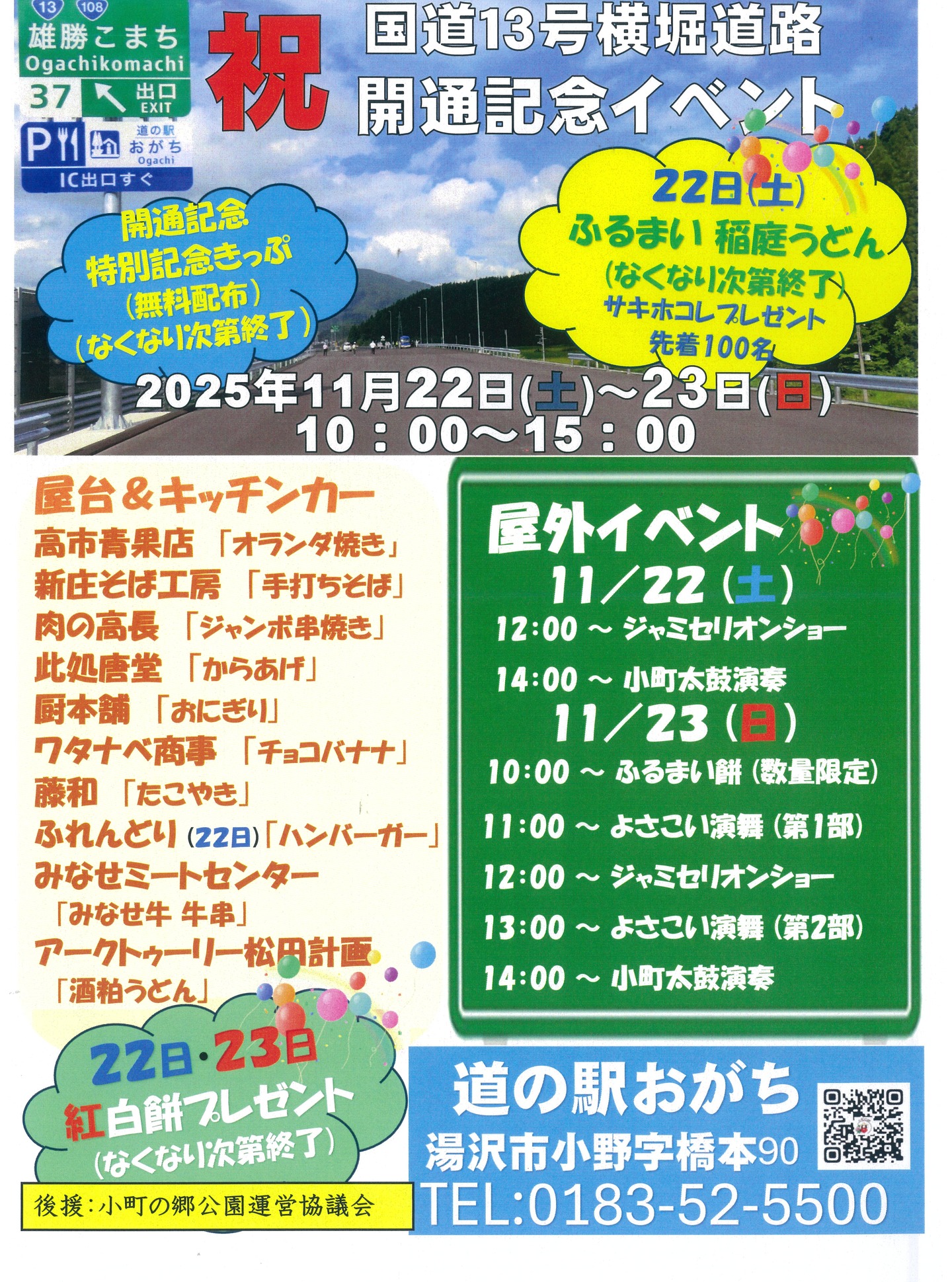 | 祝 国道13号横堀道路 開通記念イベント | 湯沢市・道の駅おがち | 2025/11/22(土)~2025/11/23(日) |