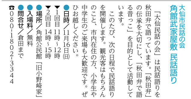 | 秋田弁の昔っこ | 秋田市・フォンテAKITA6階 | 2025/11/29(土) |