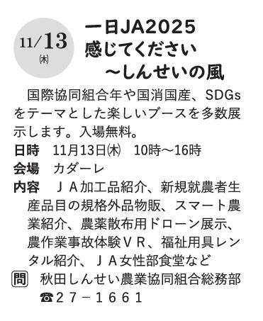 | おしごと体験キッズマルシェ※事前予約が必要なブースあり | 仙北市・角館交流センター | 2025/11/23(日) |
