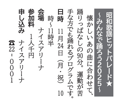 | 全国一斉 フォークダンスの日 | 秋田市・フォンテAKITA6階 | 2025/11/23(日) |