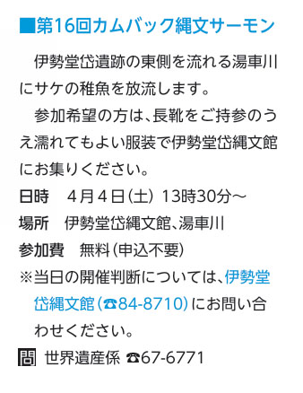 | カムバック縄文サーモン | 北秋田市・ 伊勢堂岱縄文館、湯車川 | 2026/04/04(土) |