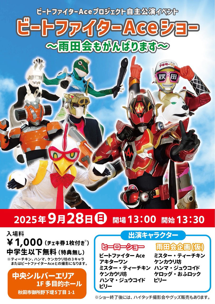 ビートファイターAceショー 〜雨田会もがんばります〜 | 秋田市・中央シルバーエリア | 2025/09/28(日) |