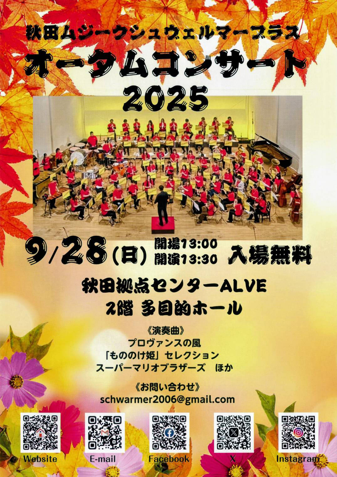 秋田ムジークシュヴェルマーブラス オータムコンサート | 秋田市・ 秋田拠点センターアルヴェ | 2025/09/28(日) |