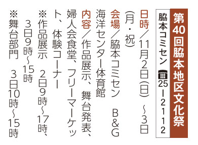 | 脇本地区文化祭 | 男鹿市・脇本コミセンほか | 2025/11/02(日)~2025/11/03(月) |